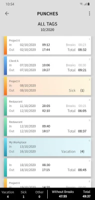 The log work tracker app also allows you to have different Tag for each clock punch to manage multiple Projects or Jobs. This is helpful when you work on a bigger project in milestones, work two jobs, or regularly work on different projects as freelancers/contractors.