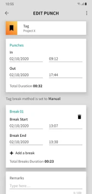 - Get support for breaks Automatic/Manual - When you create a Tag you choose if you want Manual Breaks (press on a button to start and end a break whenever you want) OR Automatic Break Deduction - which you configure an amount of time to automatically deduct from each clock punch (you will also have an option to change it for a specific clock punch when editing the clock punch itself).