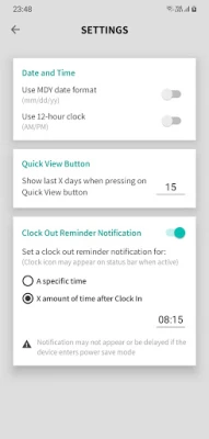 - Set up Clock Out Reminder notification for X hours after clocking in or in a specific hour of the day.