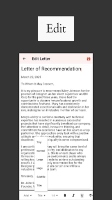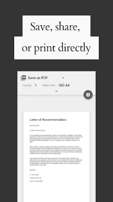 Once you are satisfied with the content, the app allows you to save the recommendation letter as a professional-looking PDF file. PDF is the standard format for professional documents, ensuring that your letter will maintain its formatting across different devices and when printed. Additionally, our app offers a direct printing functionality, allowing you to easily create a hard copy of the letter whenever needed.