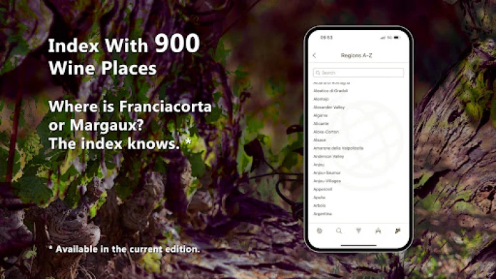 Not sure where Bandol, Charlemagne, or Frascati come from? No problem! With the app’s index (over 600 entries), you can look up any wine and immediately find its region: